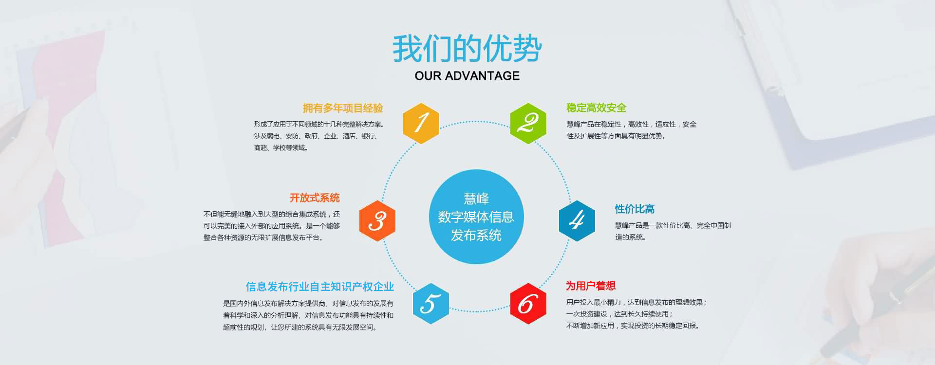 公司不僅具有開發(fā)大型項目的豐富經驗,還擁有維客計算機遠程控制系統,慧峰數字媒體發(fā)布系統,慧峰會議預約管理系統, 慧峰音視頻流媒體服務器系統,慧峰智能數據處理系統,數字化企業(yè)任務進程管理系統,智能演講提示系統,會議自動智能 排座系統等具有自主知識產權的產品。